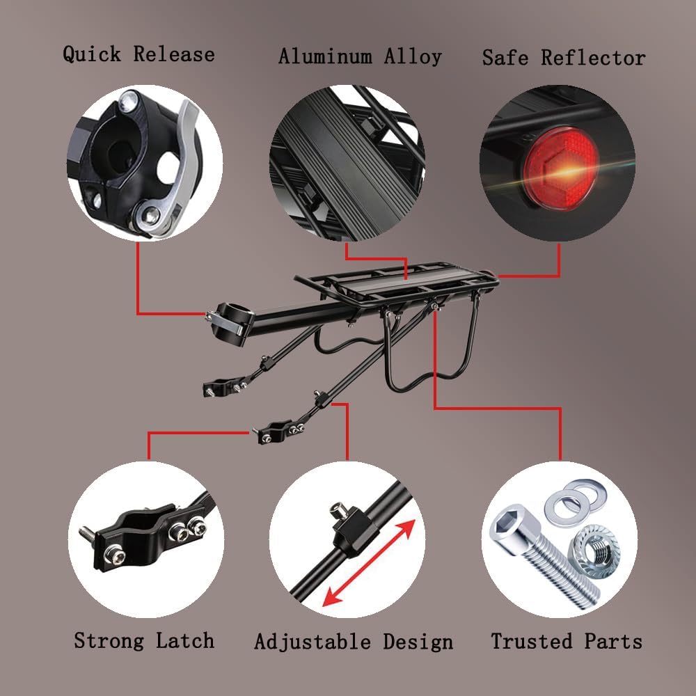 【Large Load and High Quality】Bike rear rack made of high strength aluminum alloy material,lightweight and carries up to 110 lbs. The bike cargo rack with smooth rust-proof coating and stainless steel screws will not get rusty after light rains. The whole frame is welded by TIG method that make the bike back rack more stable and pressure-resistant