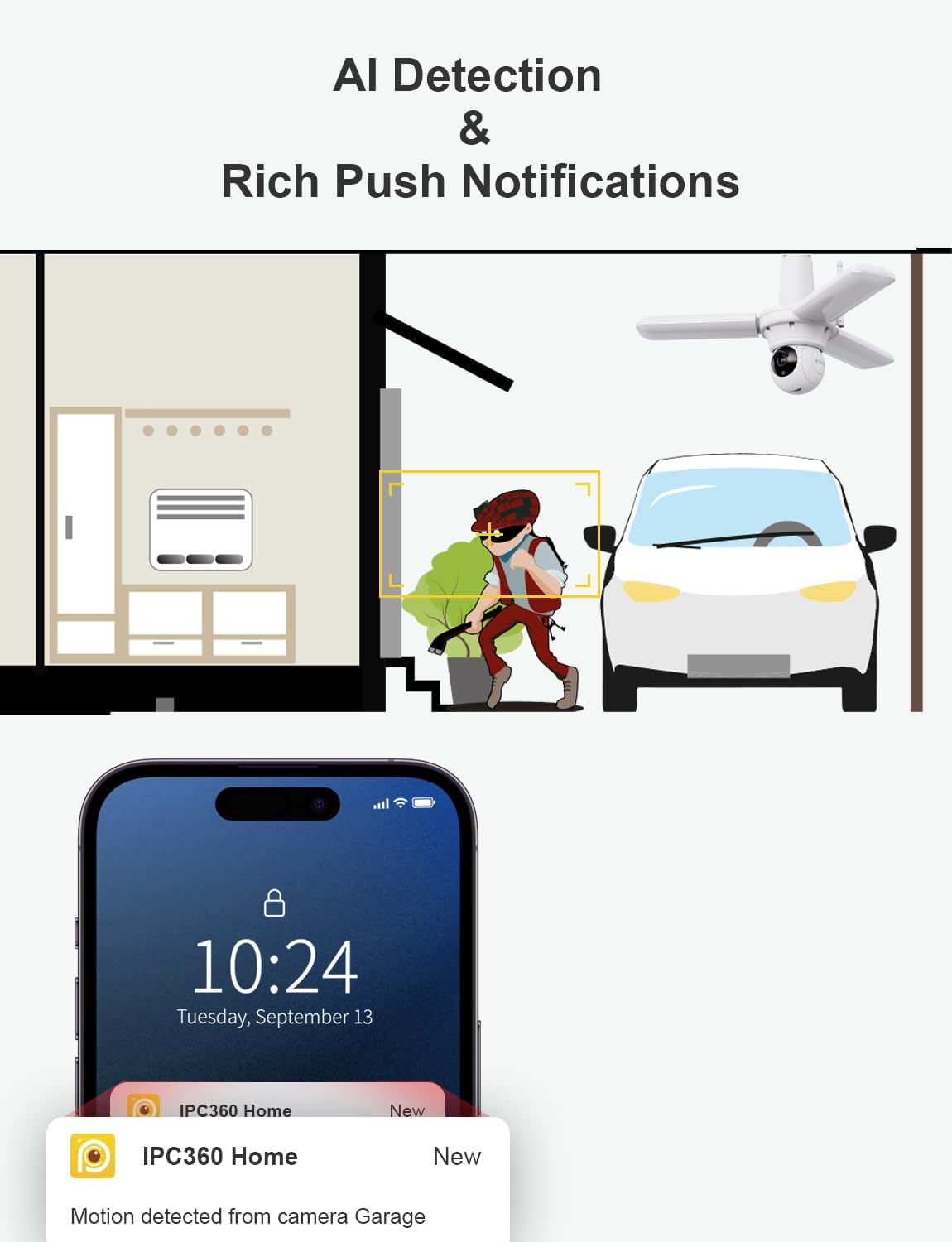 [APP Control and Connectivity] Supports WiFi connection (2.4GHz), controlled through the IPC360 Home app. Enables remote control of light on/off, scheduled lighting activation, and adjustment of light brightness via the app. Supports TF card and cloud storage for video recording and playback. Allows multiple-user sharing, facilitating collaborative monitoring and management