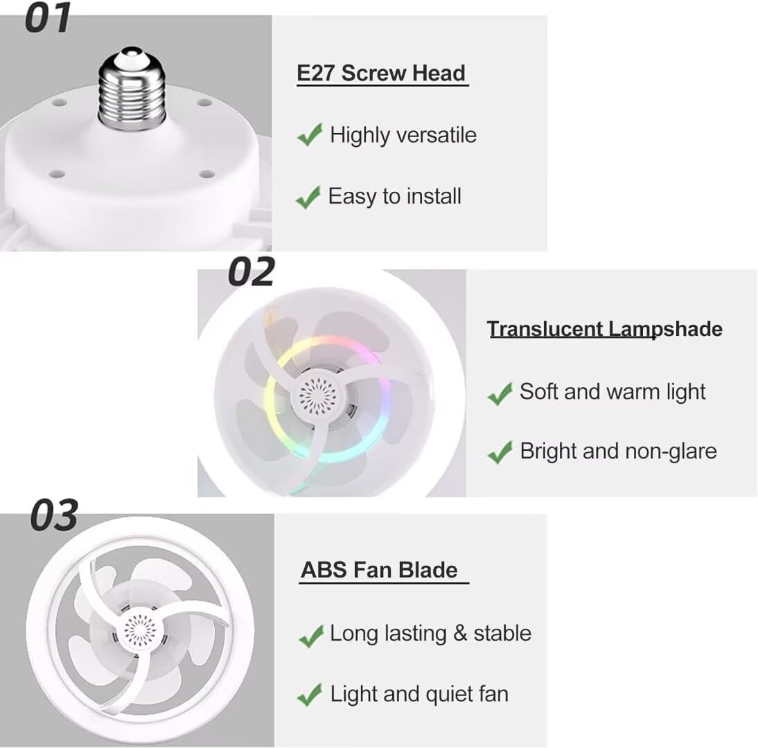 【Ceiling Fan with Light】This small socket fan meets both of your needs and saves you money! The ceiling fan with light combines an LED shade with socket fan light in an E27 install based, making installation as easy as changing a light bulb. Simply plug it into any electric light socket in your home. The screw in low profile ceiling fan is no tools or help from an electrician are required, making installation a breeze. Note: Light and fan can be used together or separately.