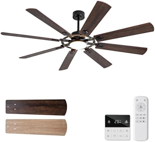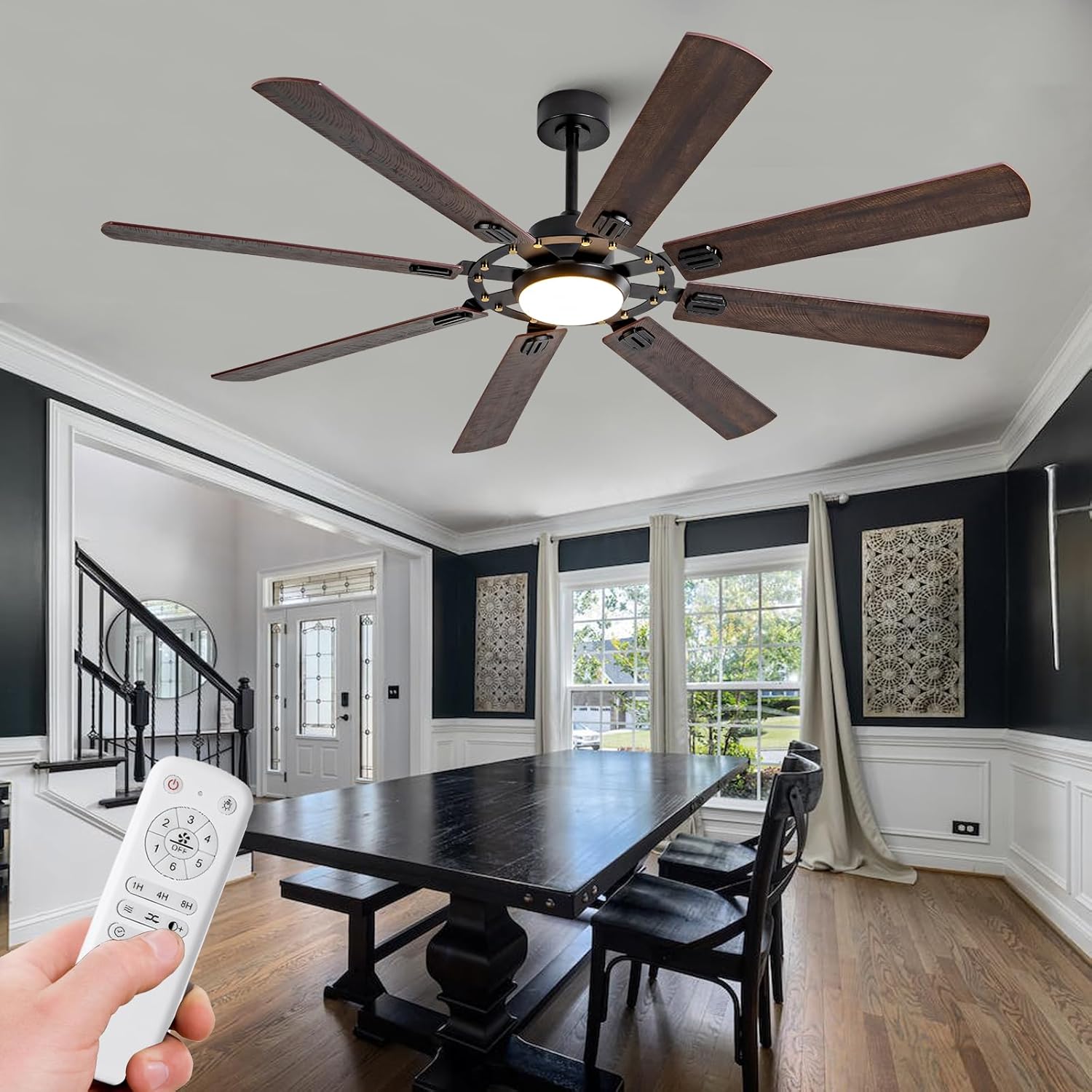 72 Inch Ceiling Fan: This large ceiling fan includes 4“, 8”, and a free 20-40 inch downrod that can be customized to fit your home's height needs, making it a versatile choice for both low and high ceilings (12-40 inches high). Its stylish fan blades feature a sleek dual-color design in black and walnut, perfectly blending industrial and farmhouse styles. With 8 fan blades, the big ceiling fan offers a cost-effective and eye-catching solution. Ideal for living room, garage, barn, or covered patio