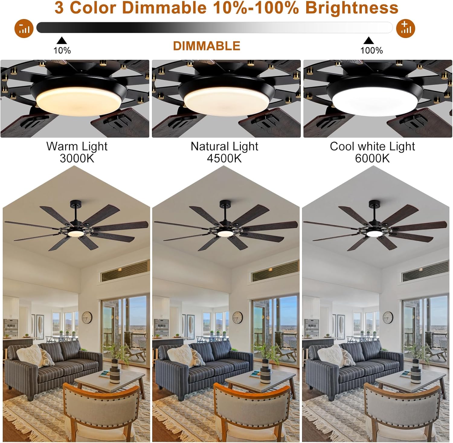 Stepless Dimming Light: Your lighting needs vary according to the use of the space. When spending a comfortable night at home, soft lighting is sufficient, while work or study requires brighter lighting. Our black ceiling fans with lights can be dimmed via a remote control, providing a brightness range of 10% to 100% and allowing you to set the perfect lighting for every situation. In addition, you can choose from three color temperatures: 3000K, 4500K, and 6000K.