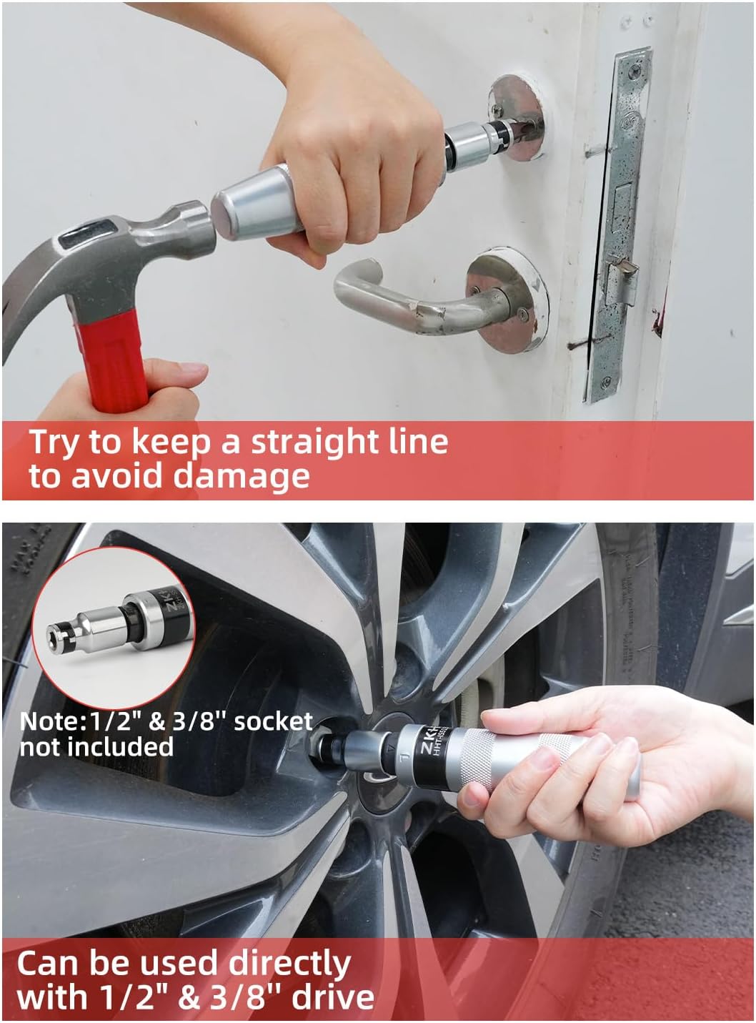 【High-Quality Materials】This 1/2'' impact screwdriver is crafted from high-quality alloy steel, featuring a 3/8'' socket adapter and a 3/8'' bit adapter. The screw bit is made of S2 steel, which offers superior impact resistance. Ideal manual impact driver for easily tackling damaged, frozen, and rusted screws and fasteners.