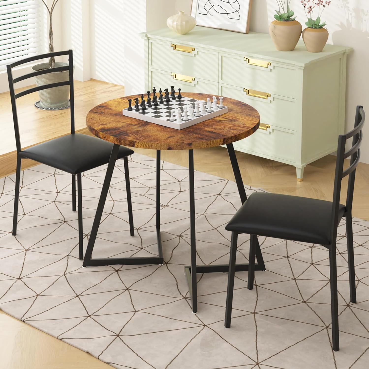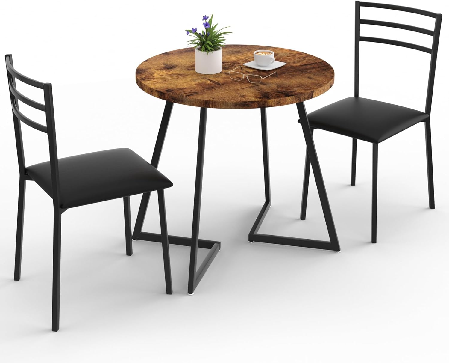 Durable & Intimate design - The round design tabletop scheme uses E1 grade high-quality board, matches the steel frame ensures this dinner table is sturdy and long term use. Max Load: 330 Lbs; The chair is equipped with a cushioned seat to relieve your body after a hard day.