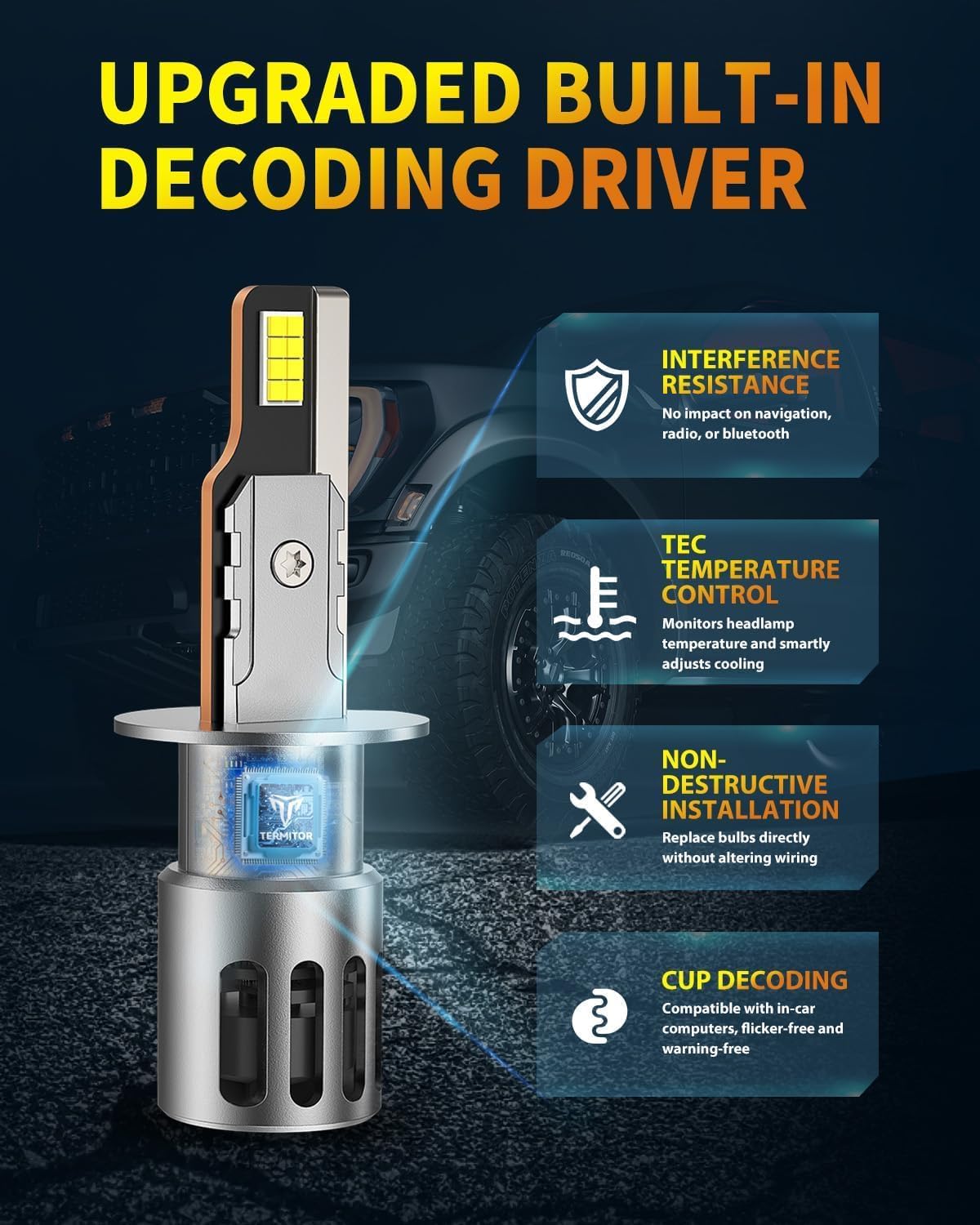 99%+ Vehicle Compatibility: Enhanced with linear decoding technology, Termitor H1 light bulbs are compatible with over 99% of vehicles. They eliminate errors and flickering and are designed to be CANbus-ready for a seamless experience. Note: Some sensitive models may require a CAN bus decoder; feel free to contact Termitor for assistance if needed