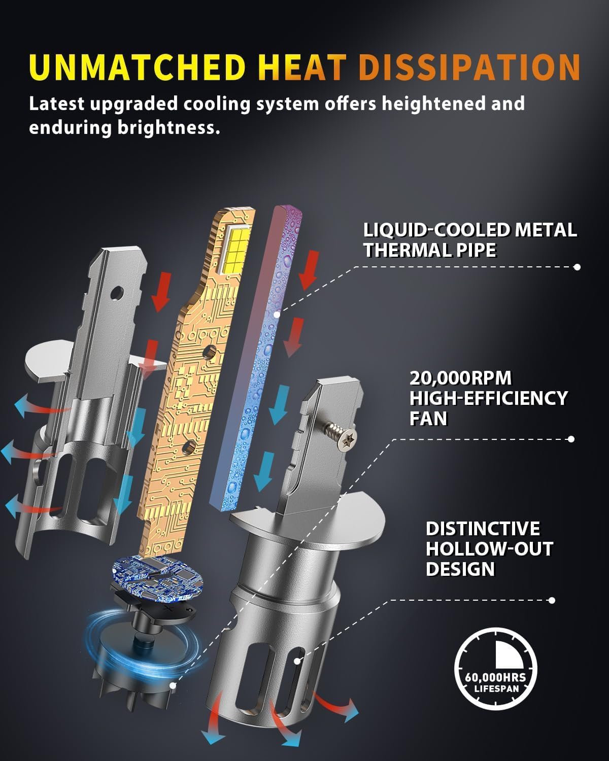 Over 70,000 Hours Lifespan: Constructed from premium materials like aviation-grade aluminum and a substantial copper baseboard, these H1 bulbs provide over 70,000 hours of consistent, stable illumination. A high-speed cooling fan effectively dissipates heat, reducing the need for frequent replacements