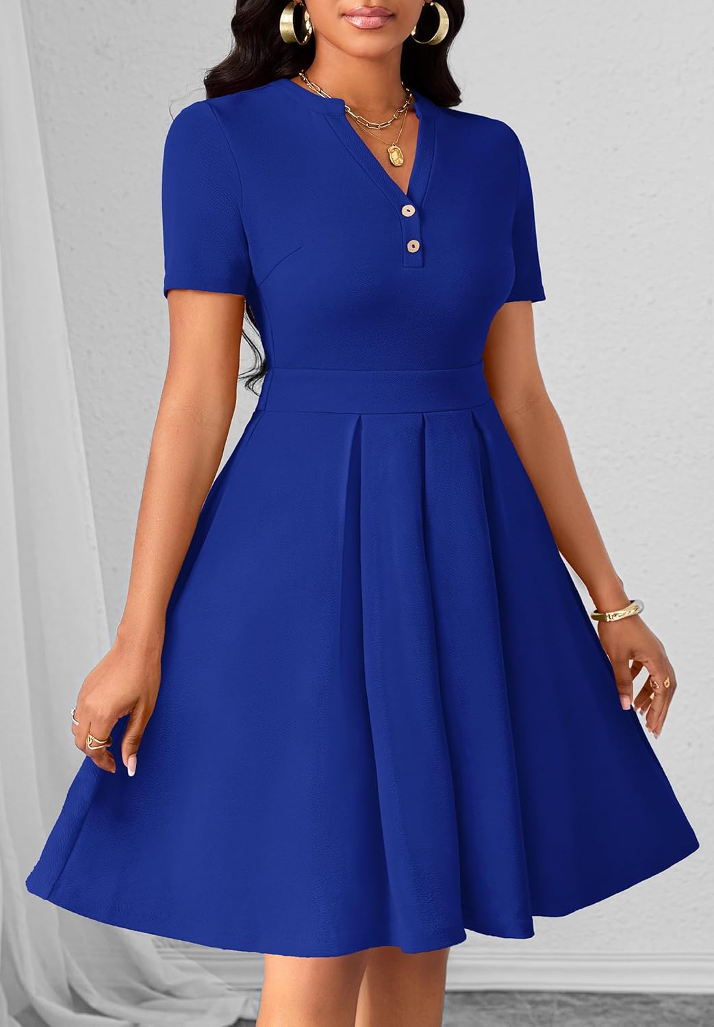 Womens Short Sleeve V Neck Casual Semi-Formal Dress Wedding Guest Cocktail Dresses with Pockets