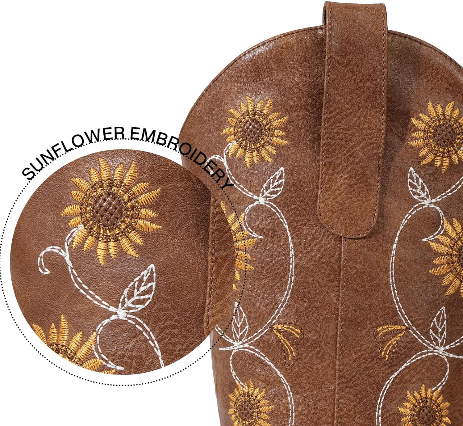 Cowboy Boots for Women - Mid Calf Western Sunflower Cowgirl Boots with Floral Embroidery, Square Toe Stitched Pull On Retro Design, Perfect for Country Idyll, Concerts and More