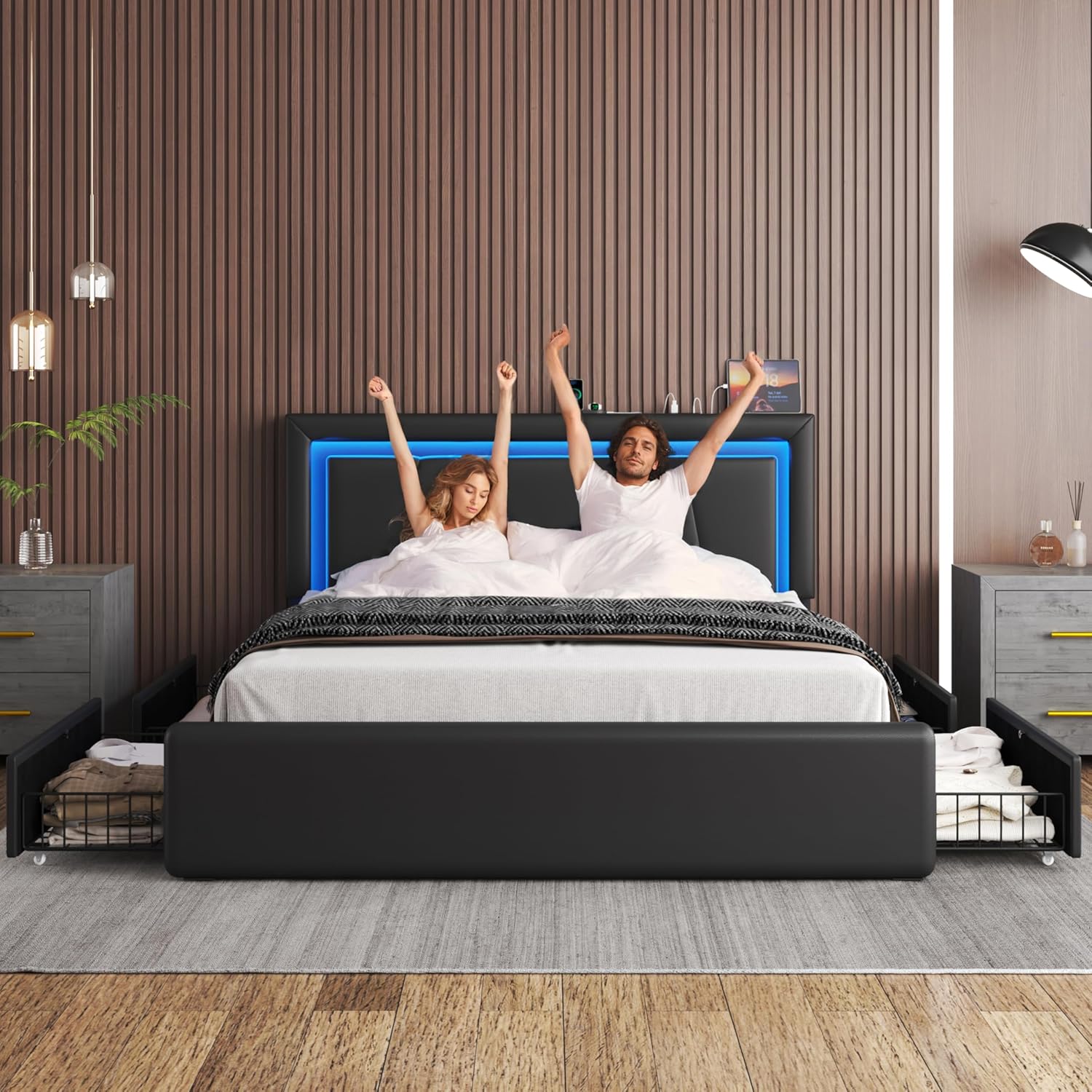 Full Size Bed Frame with 4 Storage Drawers and LED Lights, Upholstered Platform Bed with Adjustable Headboard and Charging Station, Metal Slats Support, No Box Spring Needed,Easy Assembly, Black