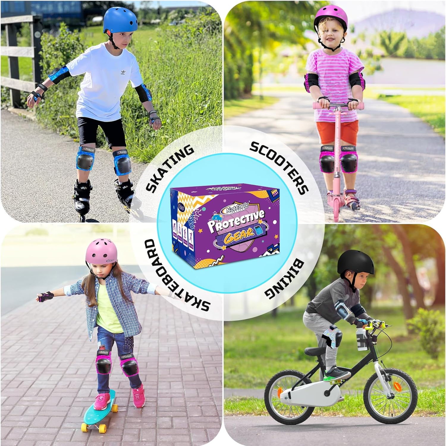 Properly wearing the Nattork protective gear set ensures your safety during outdoor activities like skating, cycling, skateboarding, and helps prevent falls for both you and your children.