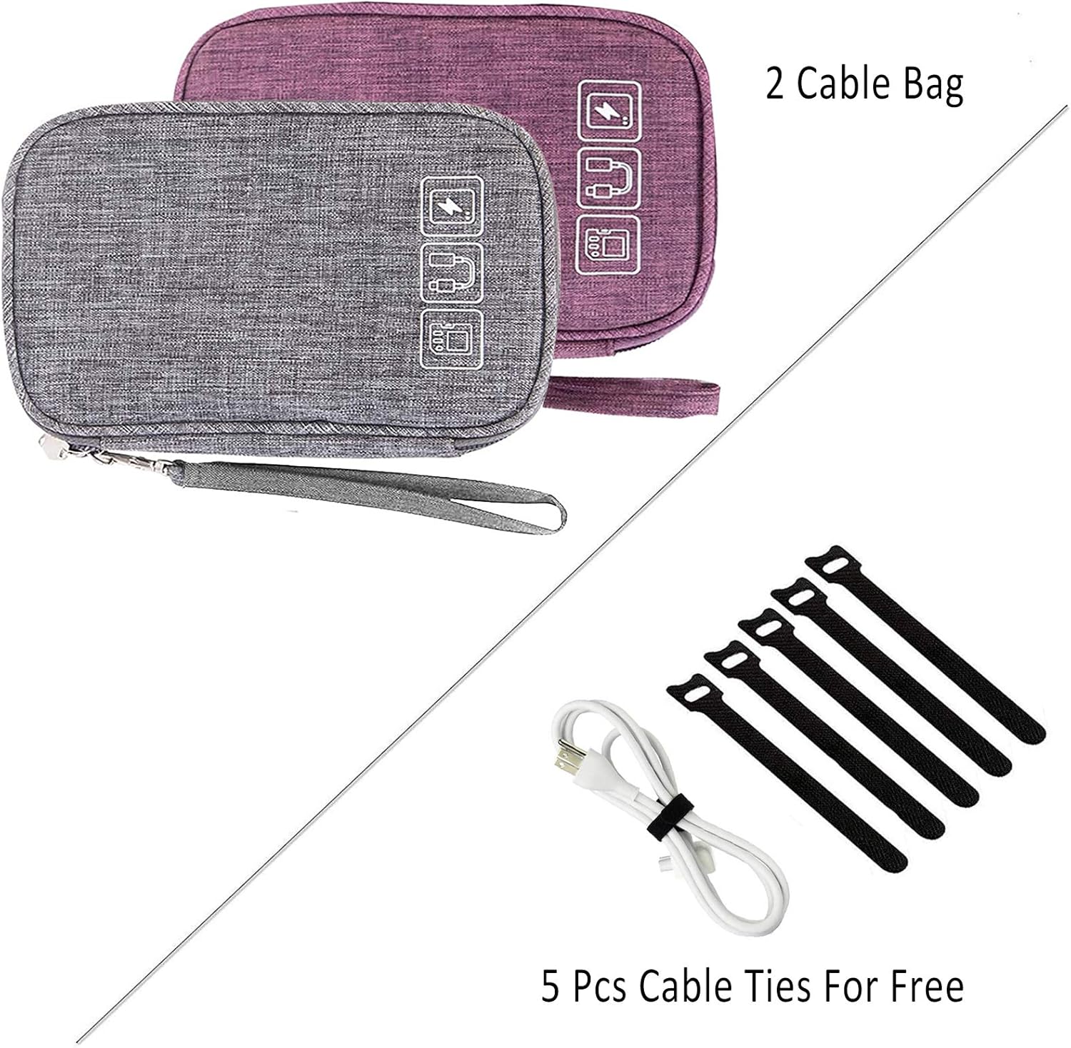 Bolsa Organizadora de Cables, 2UDADES Bolsa Organizadora de Cables de Viaje Bolsillo Pequeño para Accesorios Electrónicos Bolsa de Almacenamiento de Cables para Cable, Cargador, Teléfono, USB, Tarjeta SD, con 5 piezas de Cintas para Cables (Gris+Púrpura)